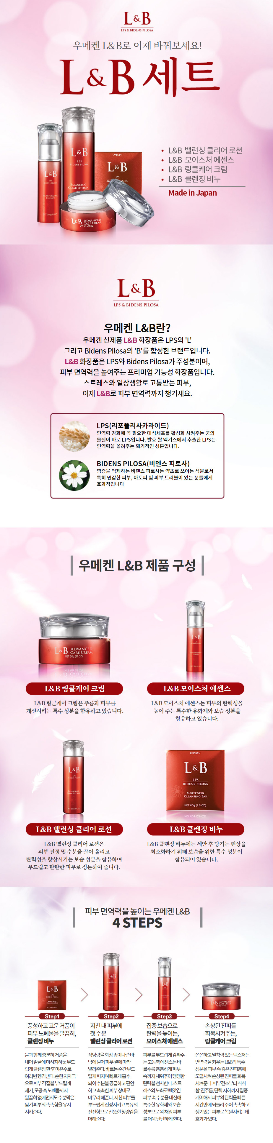 (우메켄) L&B 피부 면역 비덴필로사 기초4종 세트 크림 에센스 로션 비누