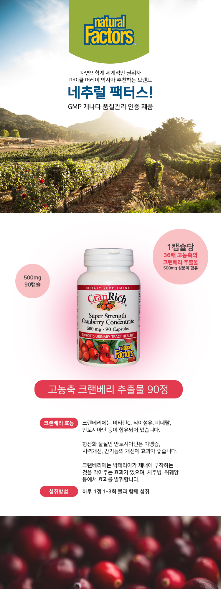 내추럴팩터스 크랜리치 크랜베리 농축액 500mg 90정